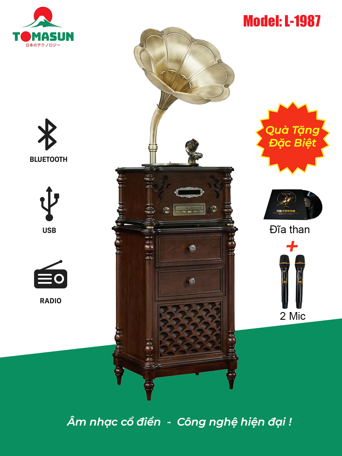 | Đánh giá chất lượng | Mẫu L-1987 là sự kết hợp hài hòa giữa thiết kế hoài cổ và công nghệ hiện đại. Chất liệu cao cấp, độ bền cao, vừa để nghe nhạc vừa tạo điểm nhấn nội thất. |